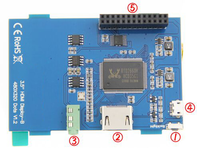 ⑤樹莓派26PIN母座:用作樹莓派顯示器時從此處獲取電源和返回觸摸